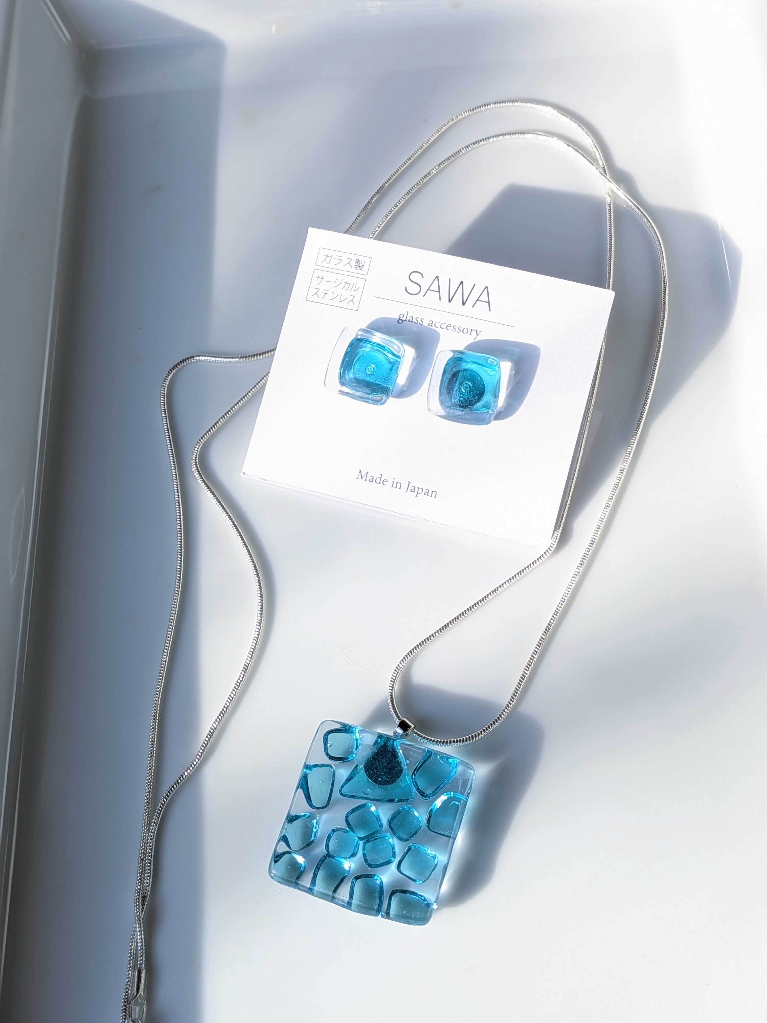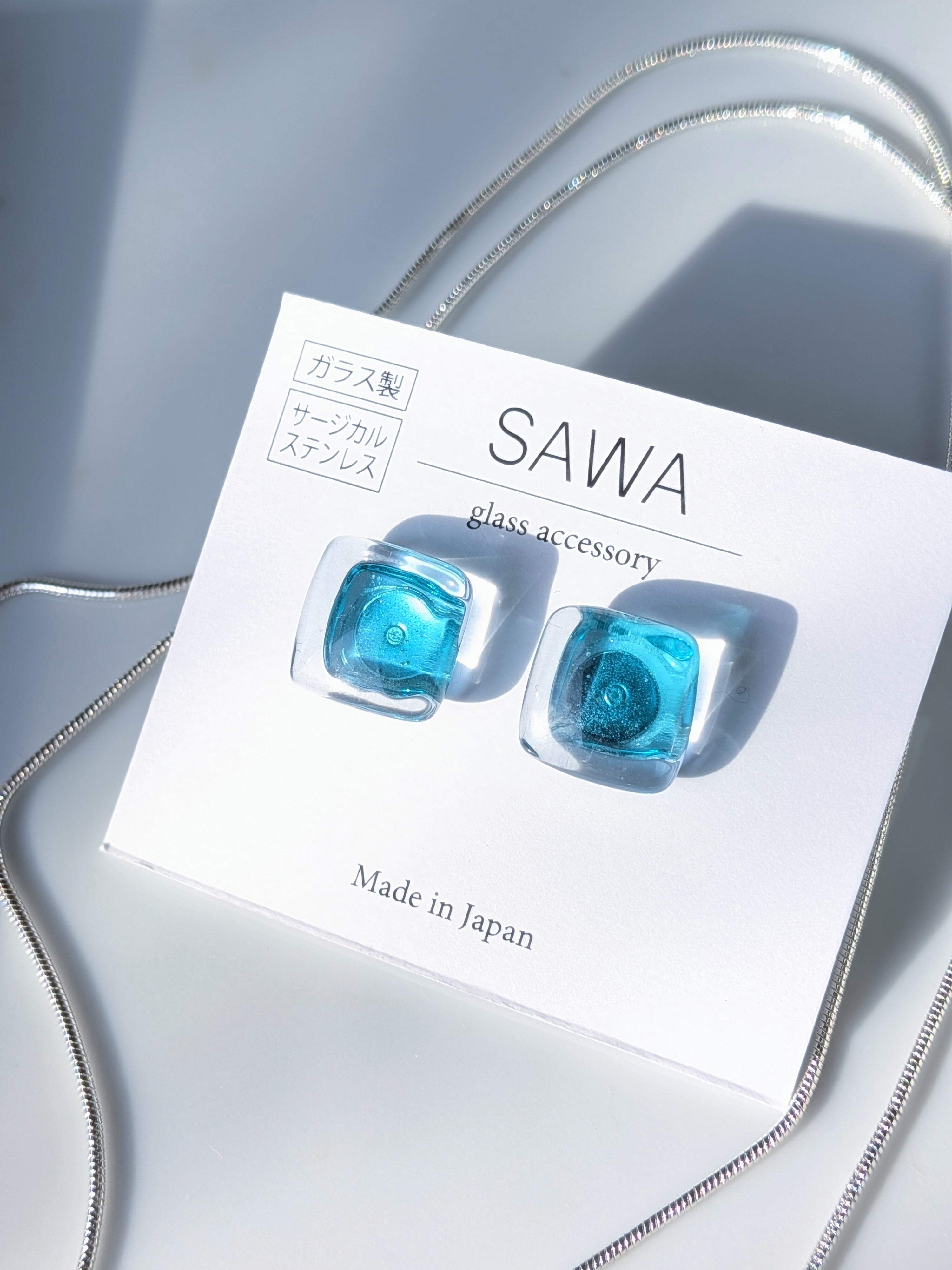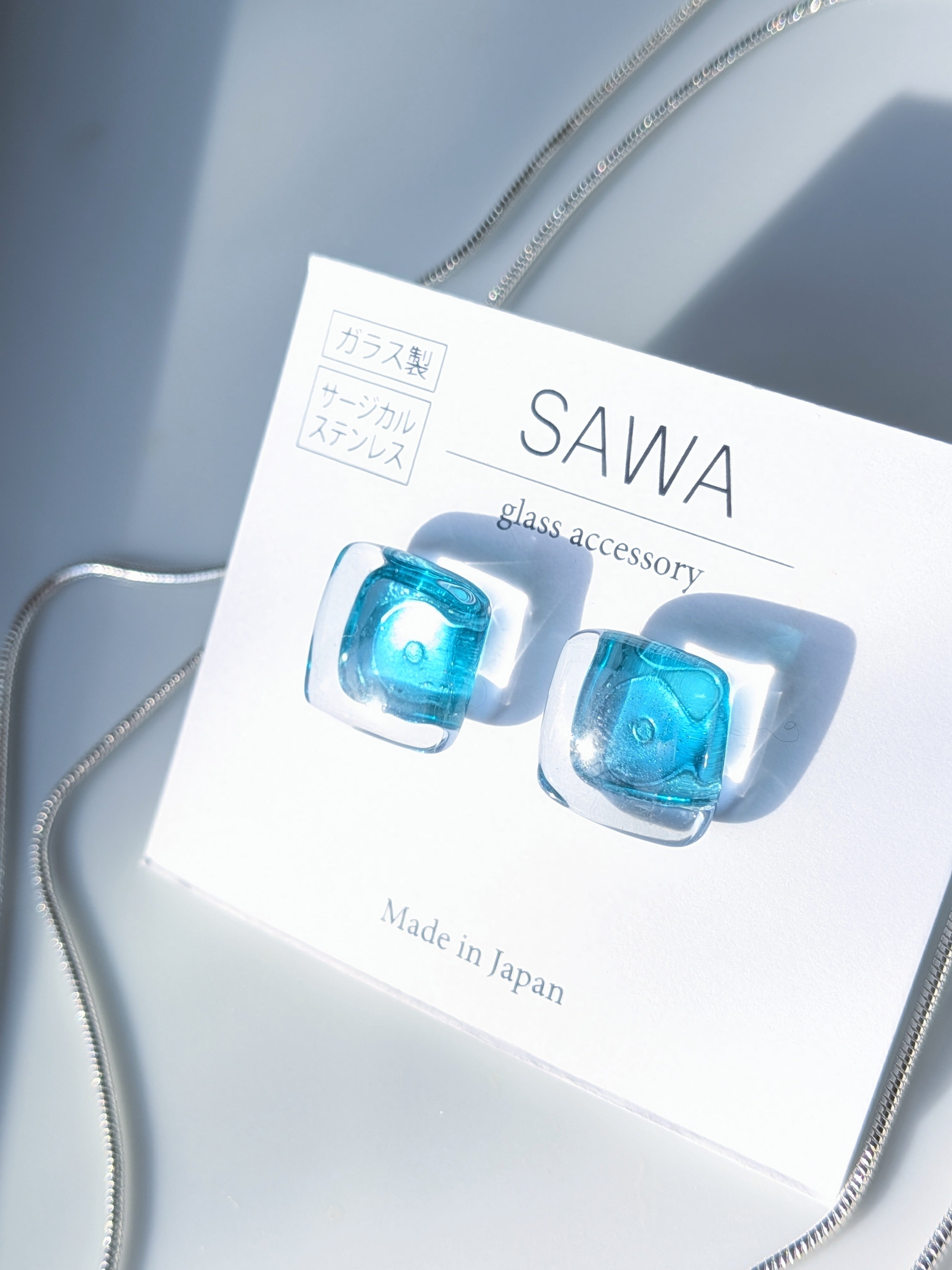 2色のブルーガラスを重ねて作られたこのアクセサリーは、まるで深海のような神秘的な色合い。シンプルなデザインながらも洗練された雰囲気、大人の女性にぴったりのアイテムです。煌めくガラスの輝きが、あなたのファッションに特別な魅力を添えてくれます。ガラスの色褪せない輝きや美しさを感じられるアイテムです。