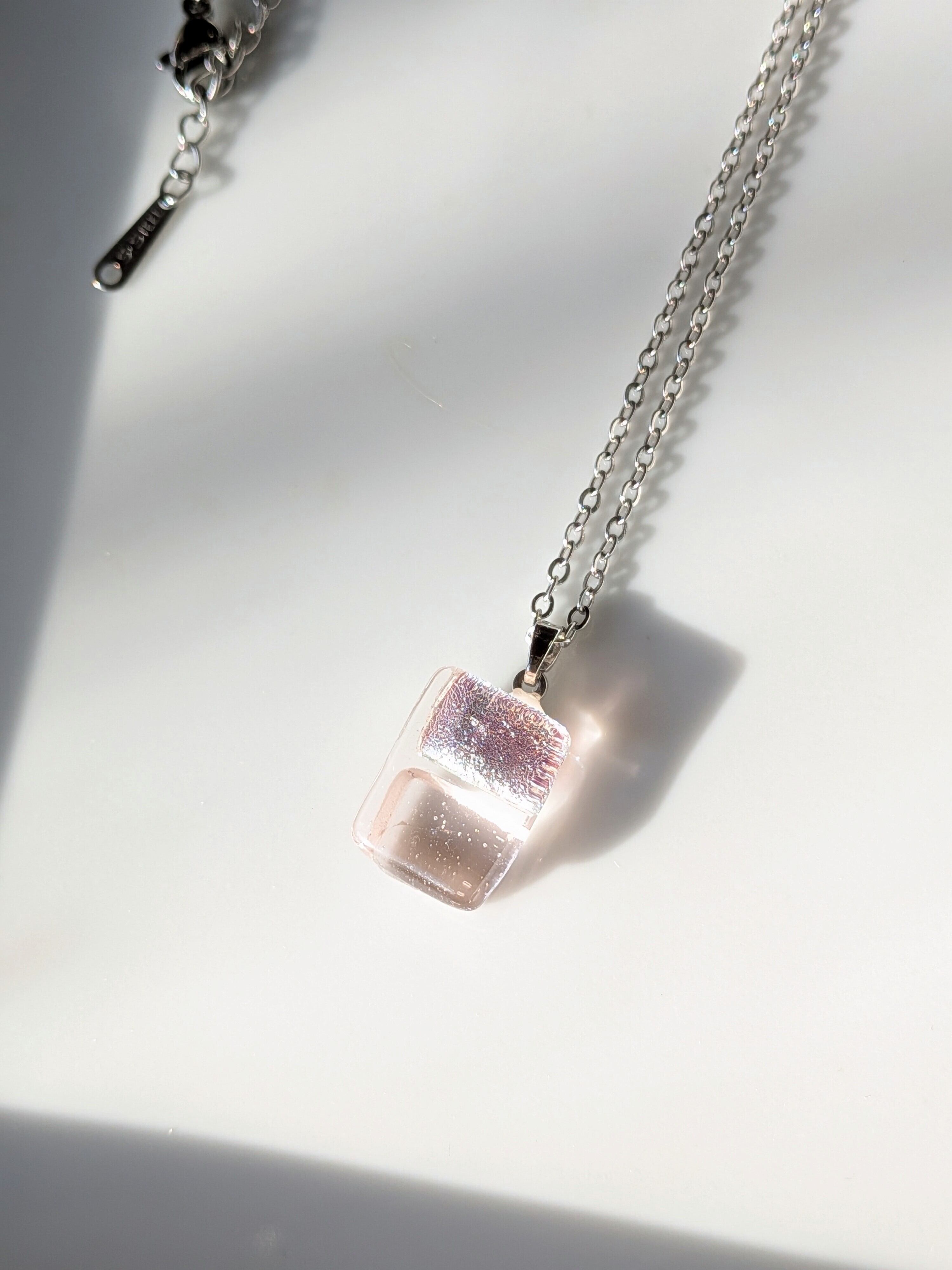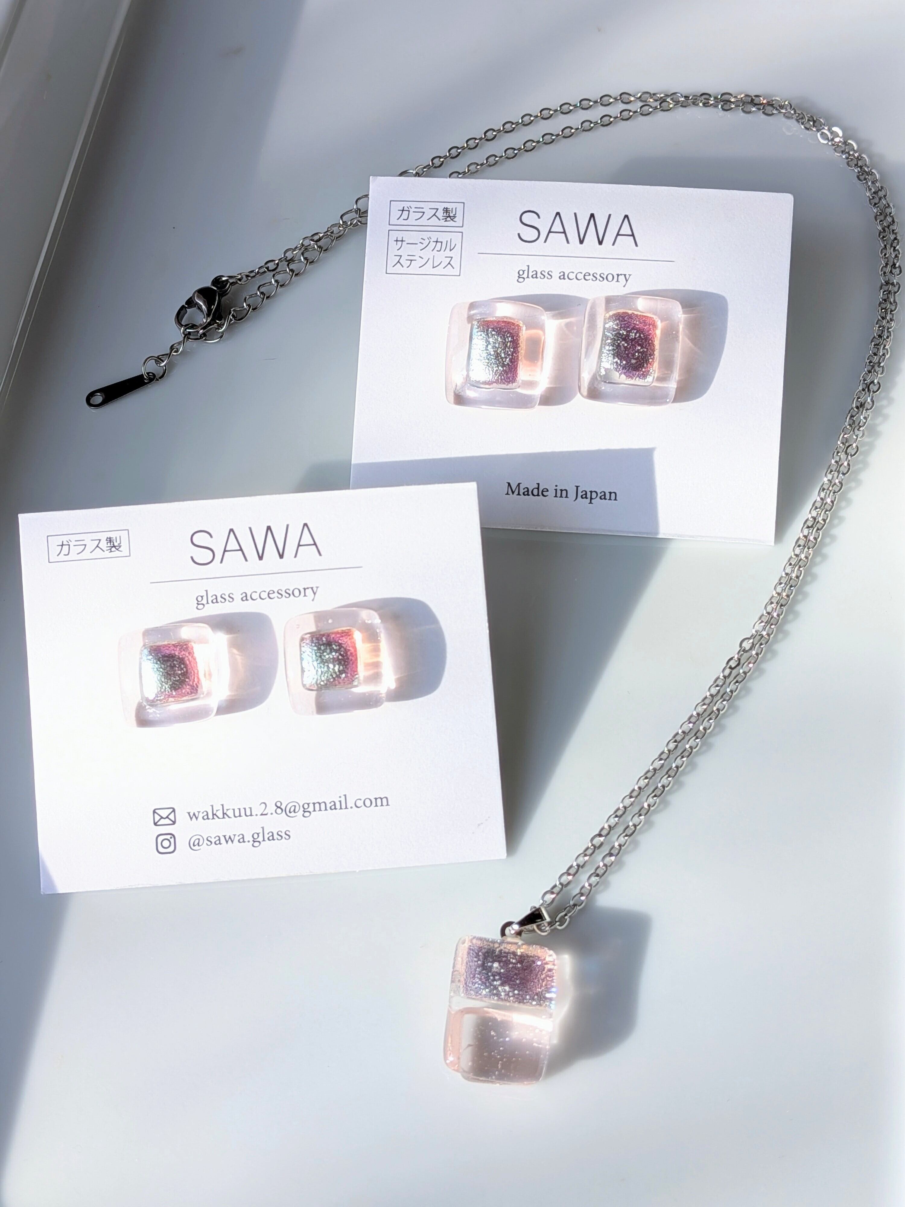 透き通る淡いピンクガラスを使用したシンプルなデザインです。ピンクガラスの内側からシルバー色が煌めき女性らしい華やかさをプラスしてくれます。デイリー使いから特別なシーンまで幅広く活躍してくれるアイテムです。