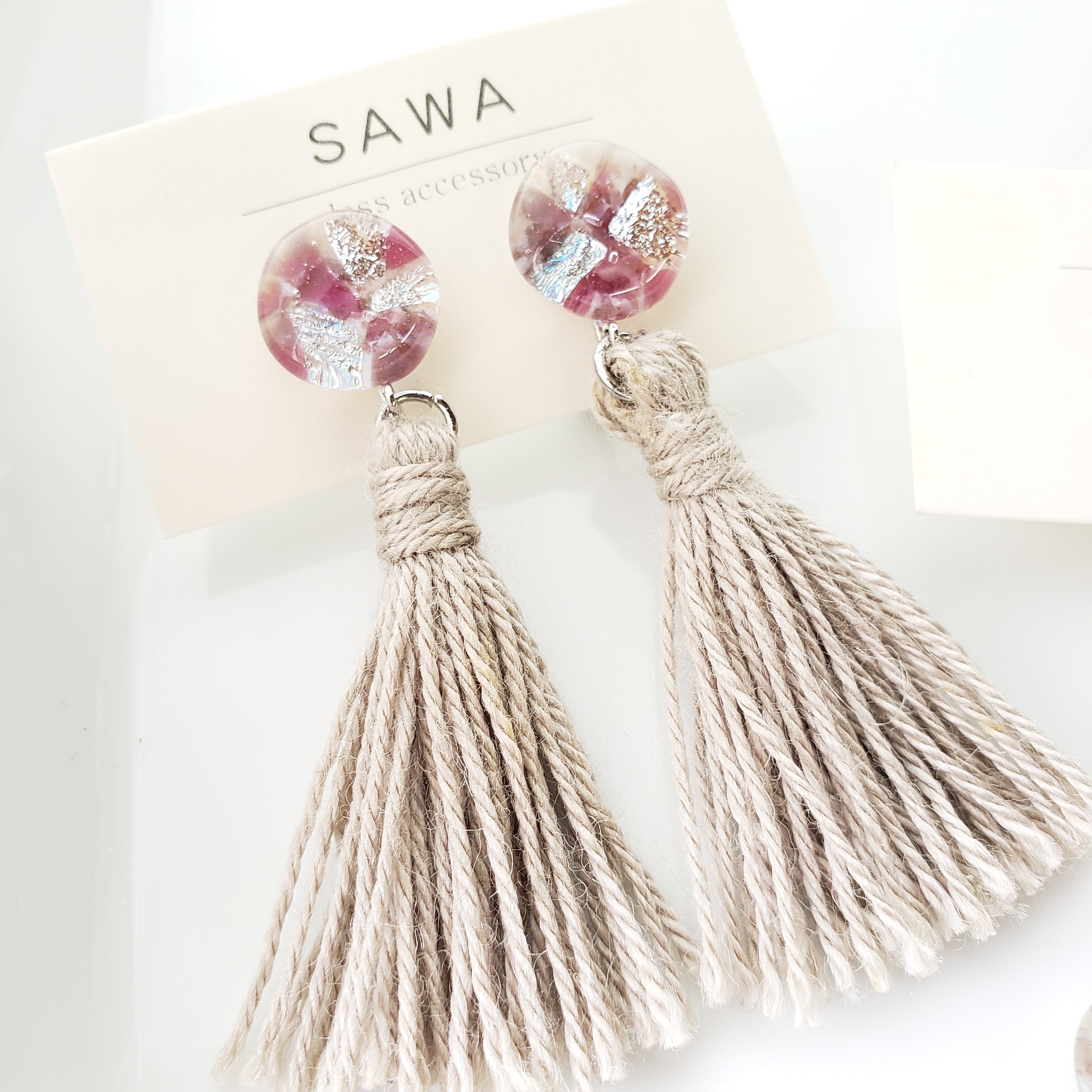 ディープピンクとシルバーガラスを閉じ込めて焼いたフリンジイヤリング。