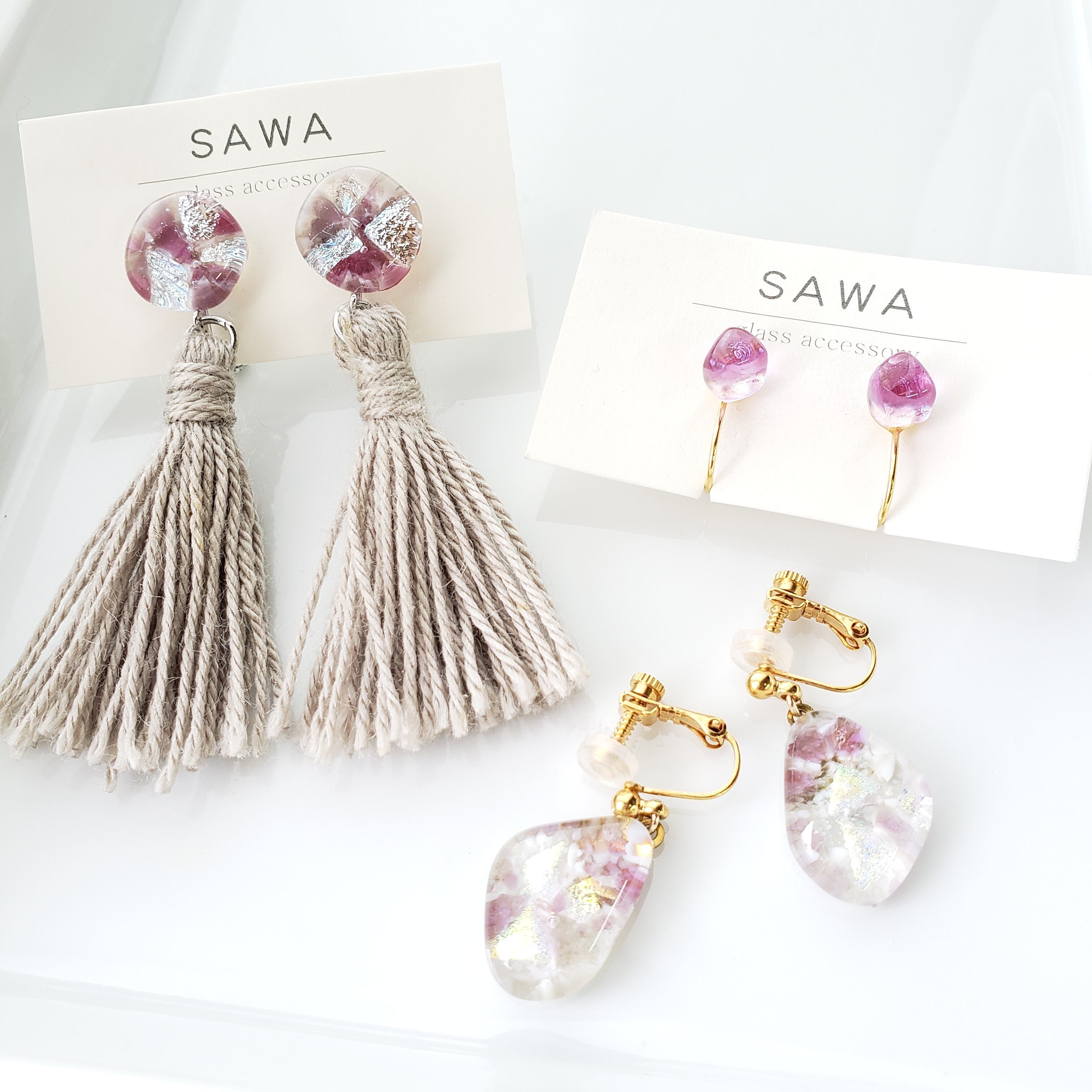 光にかざすとシルバーガラスがキラキラと輝き、ディープピンクが目を惹くアクセサリー。