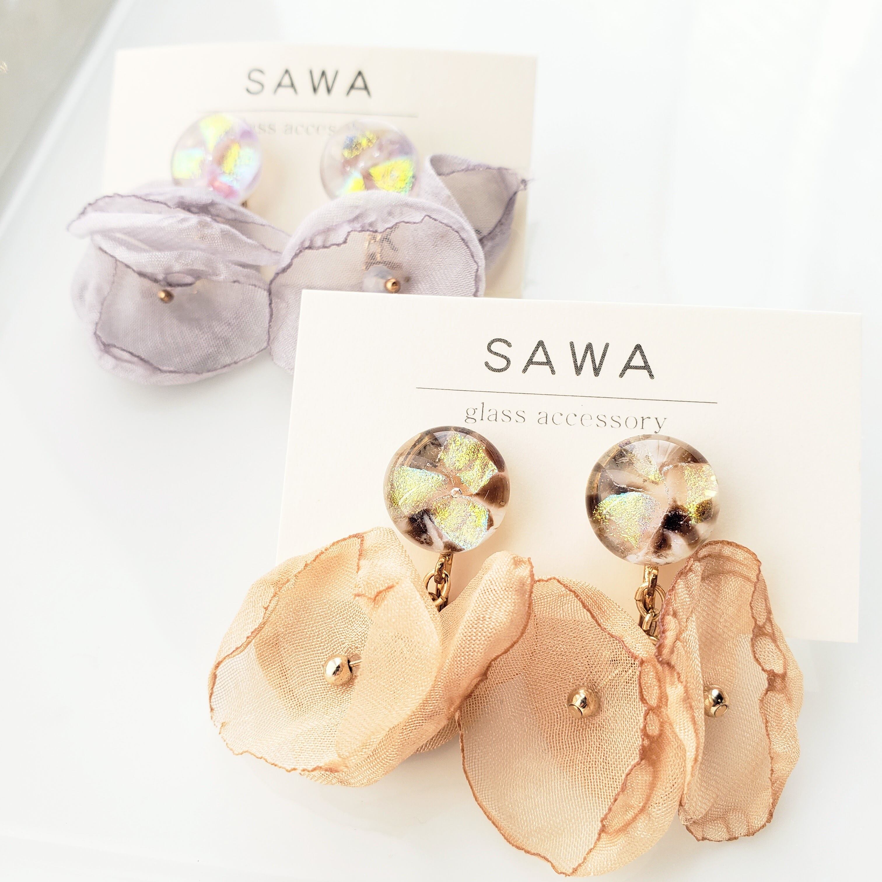 ブラウン、ホワイト色のガラスとゴールドを閉じ込めて焼いたフラワーフリンジイヤリング。